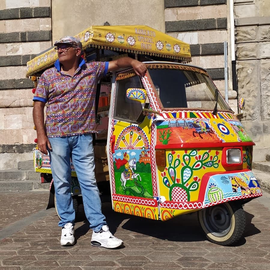 Ogni giorno, lungo Via Pirandello, tra il passaggio curioso dei turisti e i sorrisi dei locali, spicca la sua ape siciliana dipinta a mano.